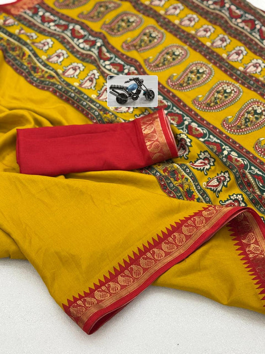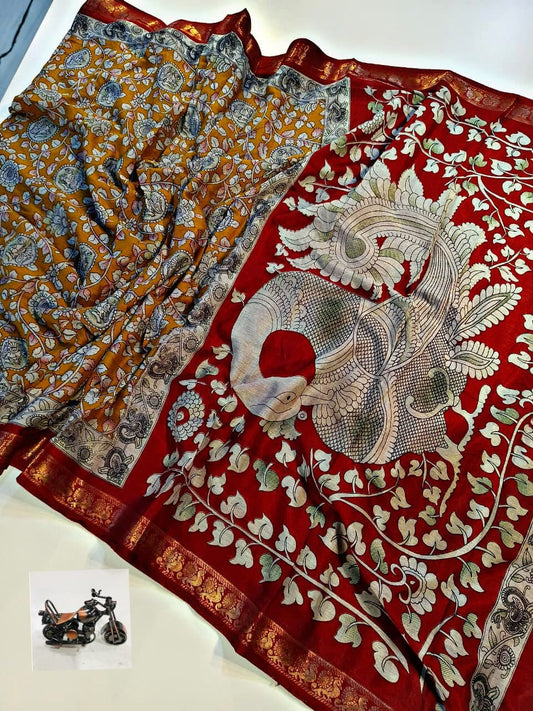 Authentic Kalamkari Print Saree in Rich Yellow Red Color for Graceful Cultural Wear