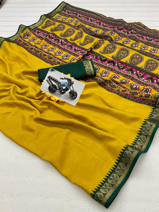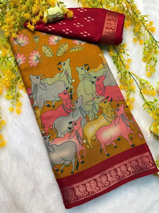 Elegant Kalamkari Print Saree in Beautiful Mustard Gold Color for Traditional Stylish Look