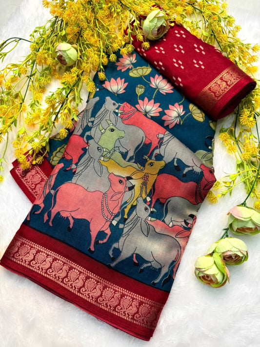 Fashionable Kalamkari Print Saree in Gorgeous Blue Color for Festive Ethnic Appearance