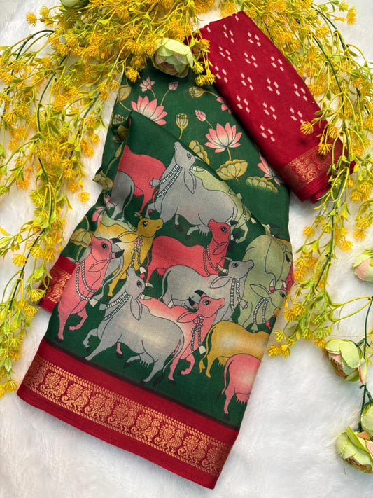 Trendy Kalamkari Print Saree in Gorgeous Green Color for Charming Ethnic Dressing