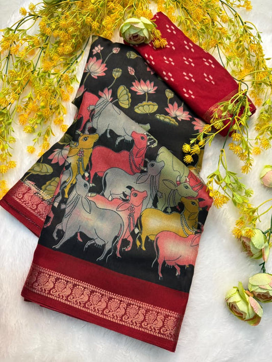 Attractive Kalamkari Print Saree in Bold Black Color for Standout Traditional Look
